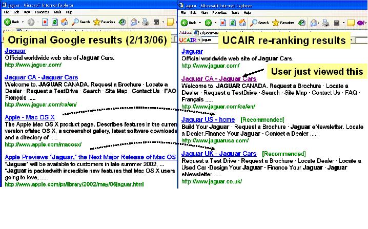 The picture on the right shows how UCAIR can re-rank search results from Google and optimize search results for a user searching information about the Jaguar car using the query "jaguar".